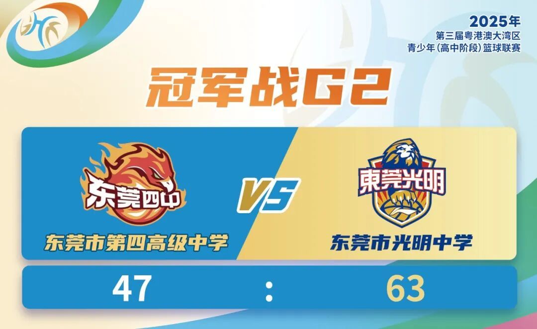 本次联赛总决赛采用主客场赛制。首回合交手中,东莞市光明中学(下称“东莞光明”)以80:59力克东莞市第四高级中学(下称“东莞四中”)主场取胜。10月30日第二回合,东莞四中主场47:63不敌东莞光明,东莞光明以两回合总比分2:0,首次获得本项赛事冠军。
