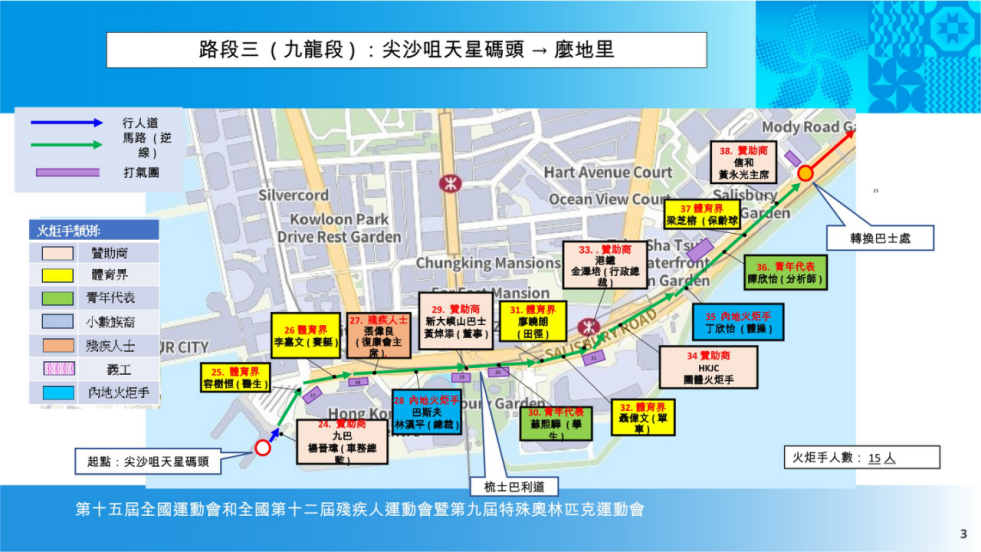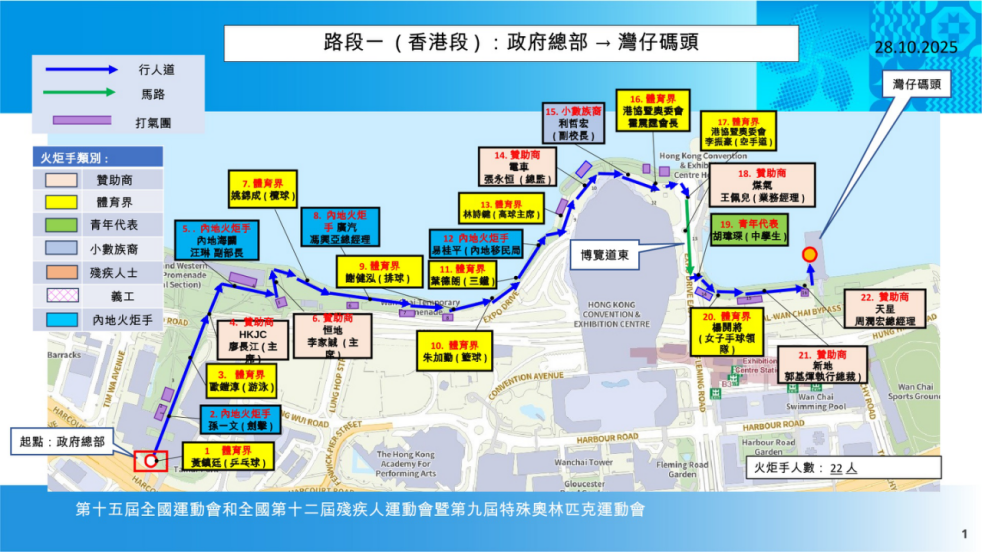 在香港,火炬自添马政府总部出发,至启德体育园收官,横越维多利亚港两岸,途经金紫荆广场、香港艺术馆等地标,尽显国际盛事之都的风采。启德体育园作为香港最新体育地标,既是赛事主场馆,也见证香港体育发展的新篇章。