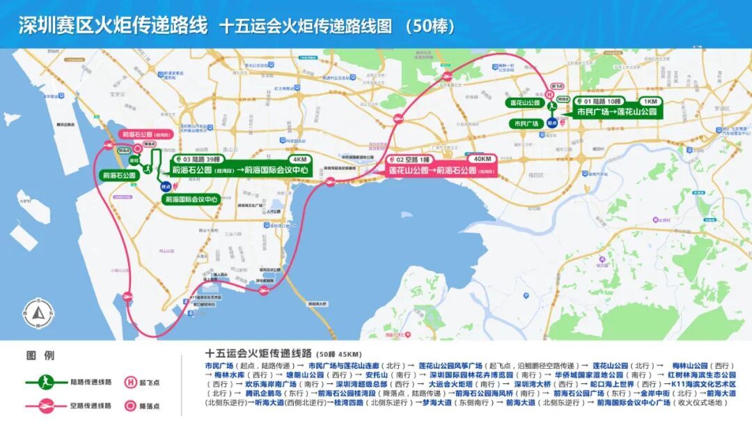 在深圳,火炬传递恰逢经济特区建立45周年,路线总长45公里,寓意“改革之路”。火炬从莲花山启程,经空中飞行至前海湾,再回到地面传递,构成“陆空联动、山海贯通”的立体画卷。改革之城、创新之城、未来之城在火焰中焕发勃勃生机,映照出深圳敢闯敢创的精神风貌。