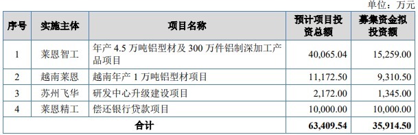 莱恩精工原拟募资35,914.50万元,用于年产4.5万吨铝型材及300万件铝制深加工产品项目、越南年产1万吨铝型材项目、研发中心升级建设项目和偿还银行贷款项目。