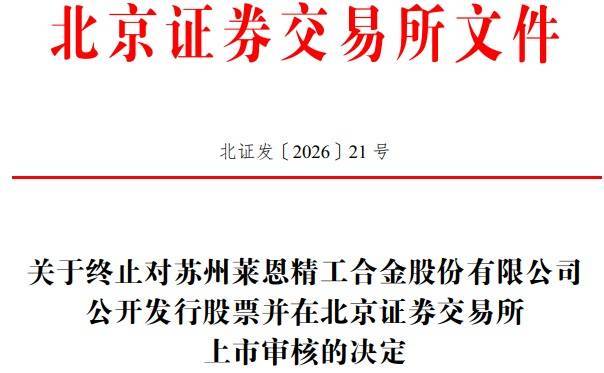中国经济网北京4月25日讯 北交所网站昨晚披露了关于《终止对苏州莱恩精工合金股份有限公司公开发行股票并在北京证券交易所上市审核的决定》。
